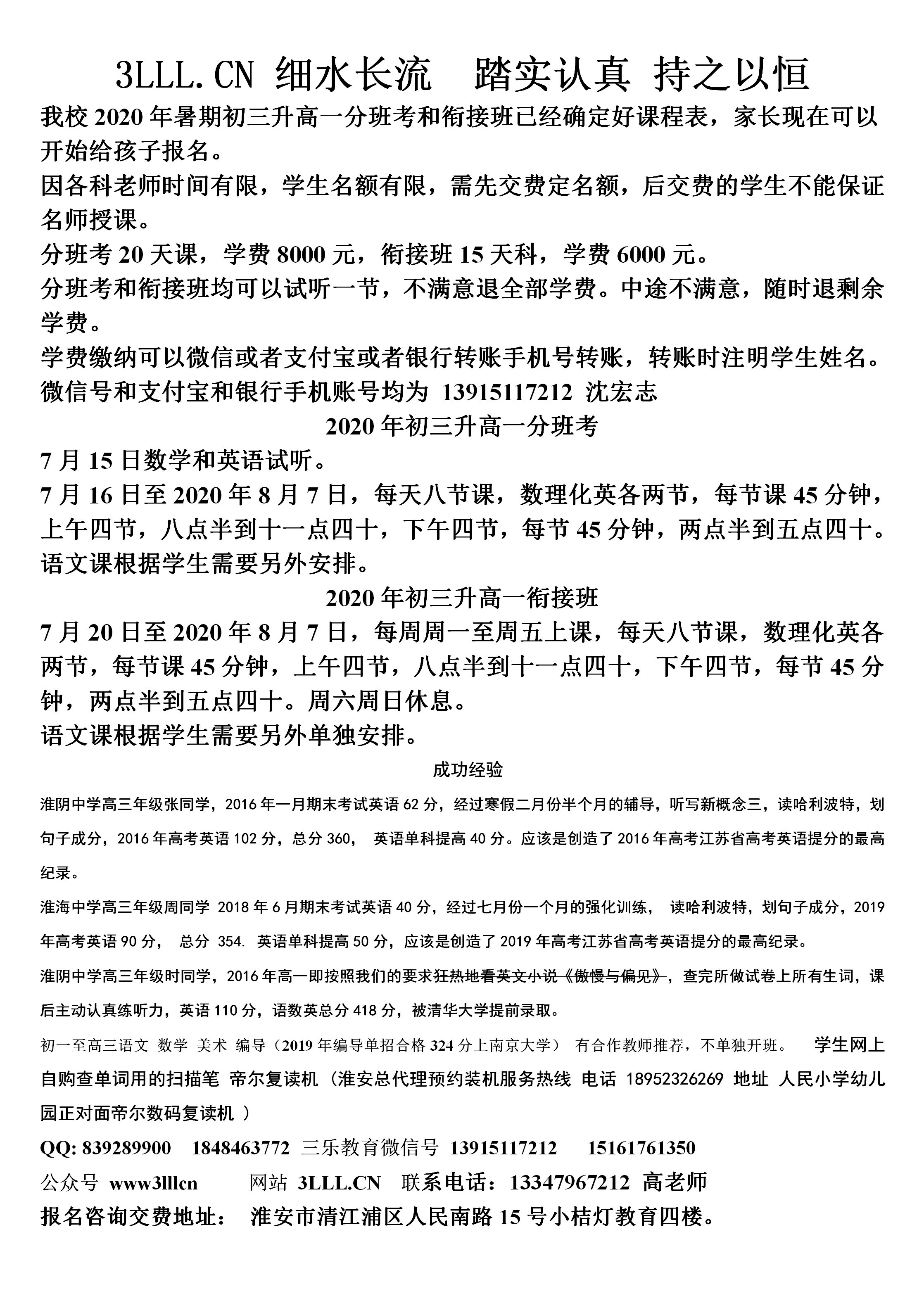 我校2020年暑期初三升高一分班考和衔接班已经确定好课程表,家长现在可以开始给孩子报名。